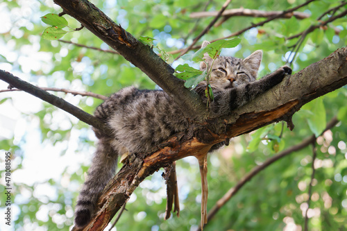 Fluffy funny kitten resting on tree branch squinting under sun rays. Summer vacation, relax concept