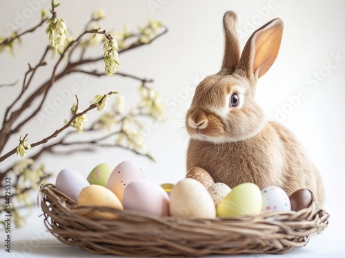 fluffy lop-eared rabbit sits next to Easter eggs, on a pleasant delicate background