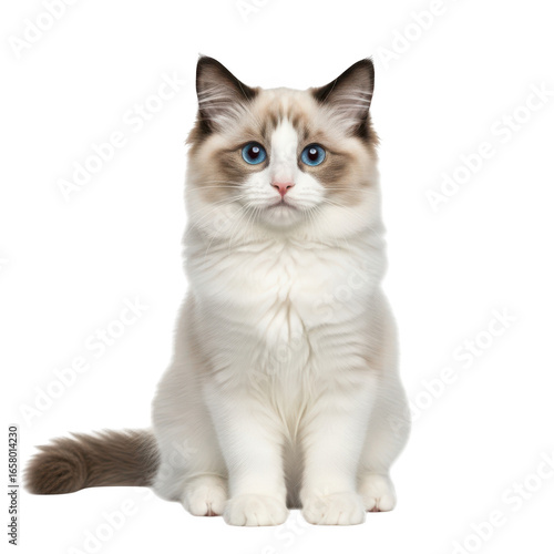 Fluffy ragdoll cat sitting gracefully isolated on transparent background