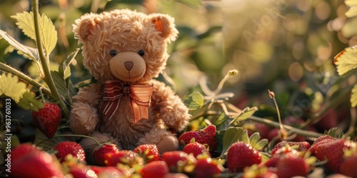 Fluffy Teddy Bear Adorned with Ribbon Amidst a Field of Juicy Red Berries