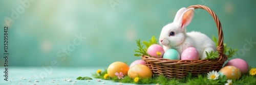 Fluffy white bunny beside colorful eggs in a basket , easter eggs, bunny ears, grass