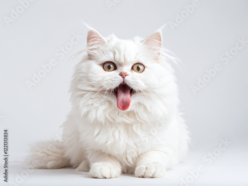 Fluffy white cat looking playful with tongue out in a studio setting