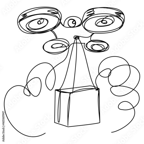 Flying drone with one line parcel on a white background. Flying assistant for delivering parcels. Vector simple drone in doodle style. Stock image of future delivery concept.