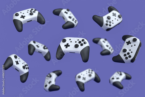 Flying gamer joysticks or gamepads on purple background with blur