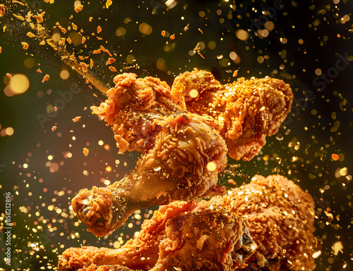 Flying pieces of golden brown fried chicken drumsticks with spices against background.