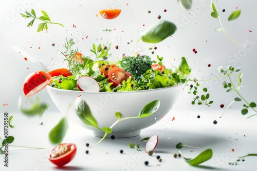 Flying vegetable salad ingredients over transparent and white bowl. Vitamins and healthy eating concept. High quality photo