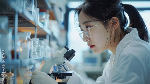 Focused Asian female scientist in a bright, modern laboratory, examining petri dish samples under a microscope. Background team working on drug development and biotechnology research