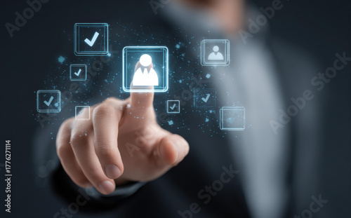 Focused businessman choosing candidate from virtual screen for recruitment. Human resource management technology for hiring and team building in modern office