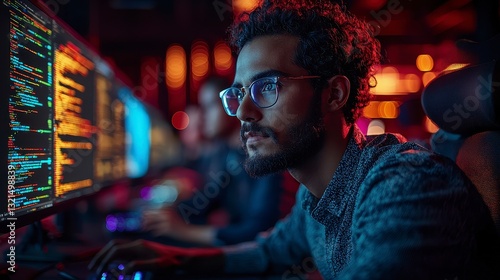 Focused Developer Working on Code in Modern Office Environment at Night