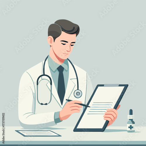 Focused Doctor in White Coat Filling Out Medical Forms on Desk