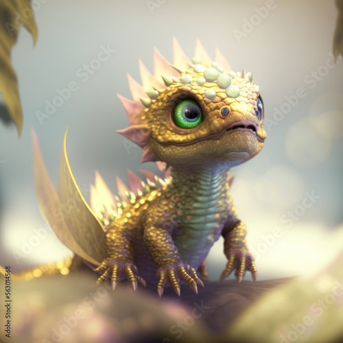 Focused little dragon with golden opalescent scales isolated on the background. Children friendly. Generative ai.