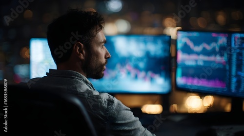 Focused man analyzing real time financial data on multiple computer screens in a dark office with city lights blurred in the background