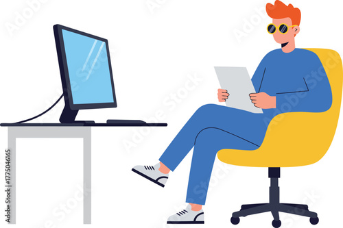 Focused man working on computer in yellow office chair vector