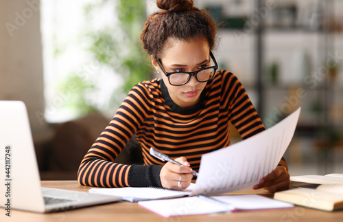 focused smart young african american woman working online on laptop or female student studying online at home