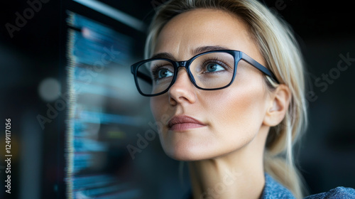 focused woman with glasses looks at computer screen displaying code, reflecting concentration and determination