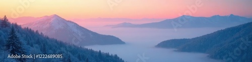 Foggy mountains at dawn with misty snowflakes, snowy, serene, frosty