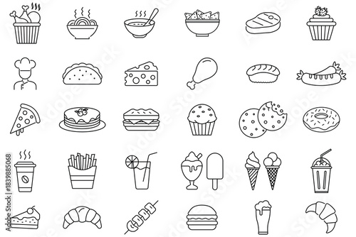Food and Drink icons vector set. Best 30 Food and drink icons. breakfast, drink, cafe, menu, dinner, food Linear icon collection. Fast food icon collection. Vector illustration.