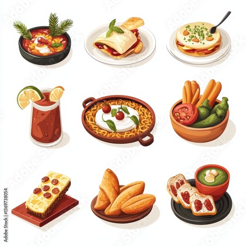 Food icon isometric concept. A colorful assortment of delicious dishes, including soups, salads, and desserts, showcasing a variety of flavors and culinary styles.