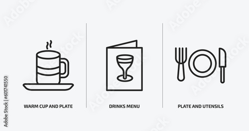 food outline icons set. food icons such as warm cup and plate, drinks menu, plate and utensils vector. can be used web and mobile.