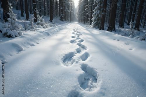 Footprints in the snow leading down a sunlit path through a winter forest
