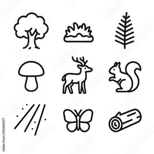 Forest Glade Icons. Outline icon set of forest glade: oak tree, moss, fern, mushroom, deer, squirrel, beam of light, butterfly,