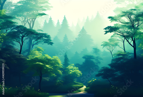 Forest landscape view above Explore the enchanting misty green forest canopy from above, where natures beauty thrives on a foggy dawn,generative ai