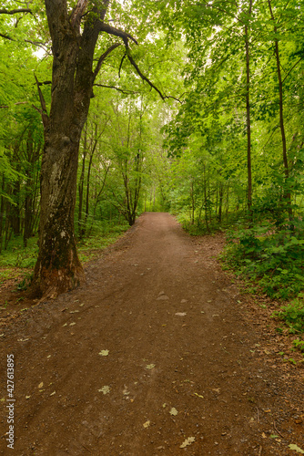 Forest path through bright green trees on a summer cloudy day