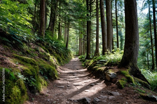 forest through towering trees whose thick trunks disappear into a lush canopy overhead
