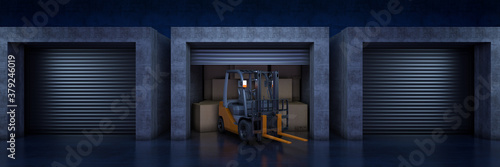 Forklift truck in warehouse or storage loading cardboard boxes. 3d rendering