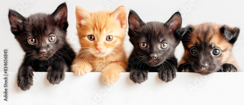 Four adorable kittens of different colors peeking over a surface, against a white background, embodying cuteness. Generative AI