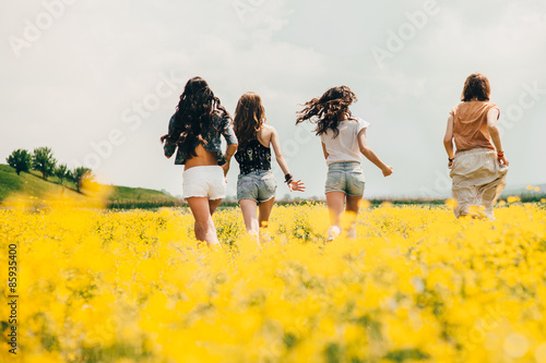 four beautiful hippie girl in a field of yellow flowers