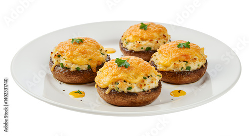 Four Cheesy Crab-Stuffed Mushrooms on White Plate