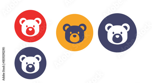 Four circular icons featuring cute teddy bear faces in different color combinations of red orange and dark blue.