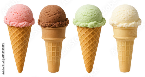 Four colorful ice cream cones in waffle cones on a white background strawberry chocolate isolated on a transparent background