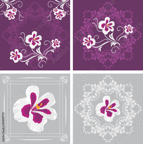 Four decorative elements with stylized pelargonium flowers