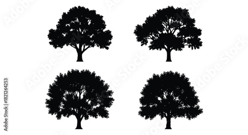 Four detailed broadleaf tree silhouettes vector set. graphic elements representing nature and environment ecology. isolated on white background, Vector, illustration
