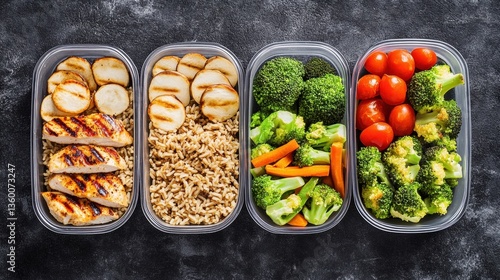 Four Healthy Meal Prep Containers with Grilled Chicken, Portobello Mushrooms, Brown Rice, Steamed Broccoli, Carrots, and Fresh Cherry Tomatoes