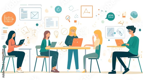 Four individuals working on laptops, sitting at desks, surrounded by abstract icons and sketches. They are collaborating on a project, each with their own role and area of expertise.