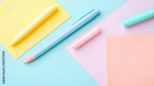 Four pastel pens alongside blank cards and a clip holder