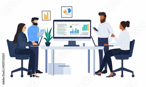 Four people analyzing data in a meeting.