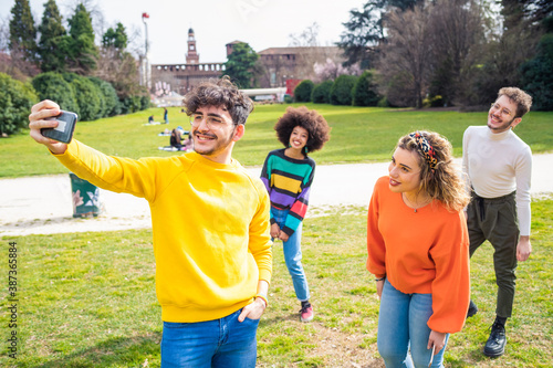 Four people multiethnic friends having fun outdoor using smartphone taking selfie