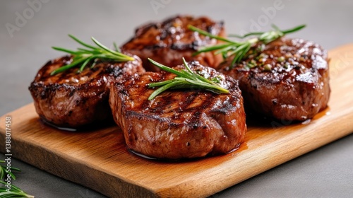 Four perfectly grilled steaks, seasoned and garnished with fresh rosemary sprigs. Juicy and flavorful, resting on a wooden cutting board