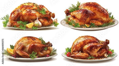 Four roasted turkeys, glistening, presented on white plates, adorned with herbs, citrus, and garlic. Each bird shows varying poses and levels of browning