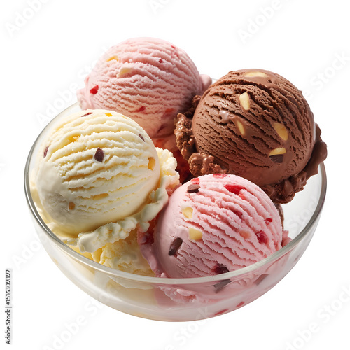 Four Scoops of Ice Cream in Glass Bowl - Vanilla, Strawberry, Chocolate, Rose - PNG Transparent Background