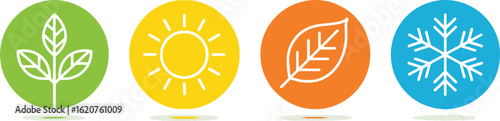 Four Season Icons Set Spring Leaves, Summer Sun, Autumn Foliage, Winter Snowflake