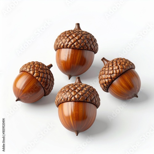 Four Shiny Brown Acorns Arranged on a White Background
