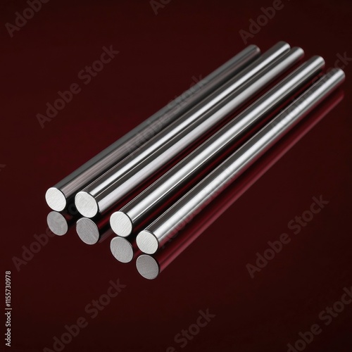 Four shiny metal rods arranged parallel on a reflective surface.