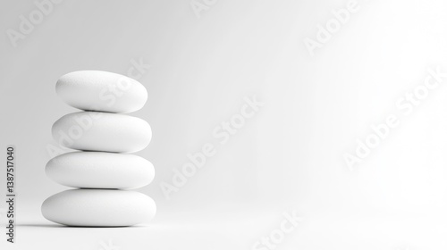 Four smooth, white stones are stacked vertically. The image features a simple composition against a white background. The lighting is even, creating a clean, minimalist aesthetic. The monochromatic