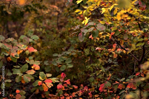 Frame of autumn leaves, colorful autumn landscape of a forest glade of bright autumn leaves on a tree, yellow, red and green colors background, selective focus, bokeh, blurred background