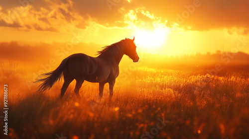Free and beautiful horse in a field at sunset in golden hour, silhouetted by the red sky and golden sun